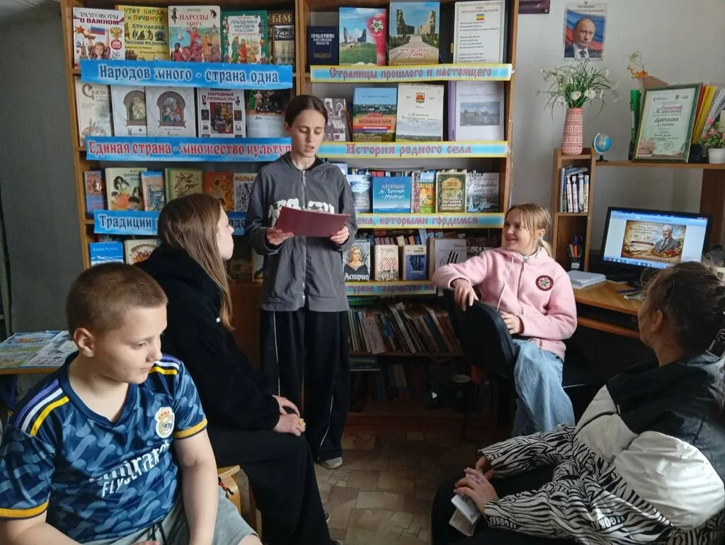 Библиотекарь рассказала детям о жизни и творчестве поэта-фронтовика, который является автором и соавтором более двадцати поэтических и литературных сборников. Особого внимания заслуживает его вклад в создание гимна Ростовской области «Святыня Донская» и гимна Азовского района.